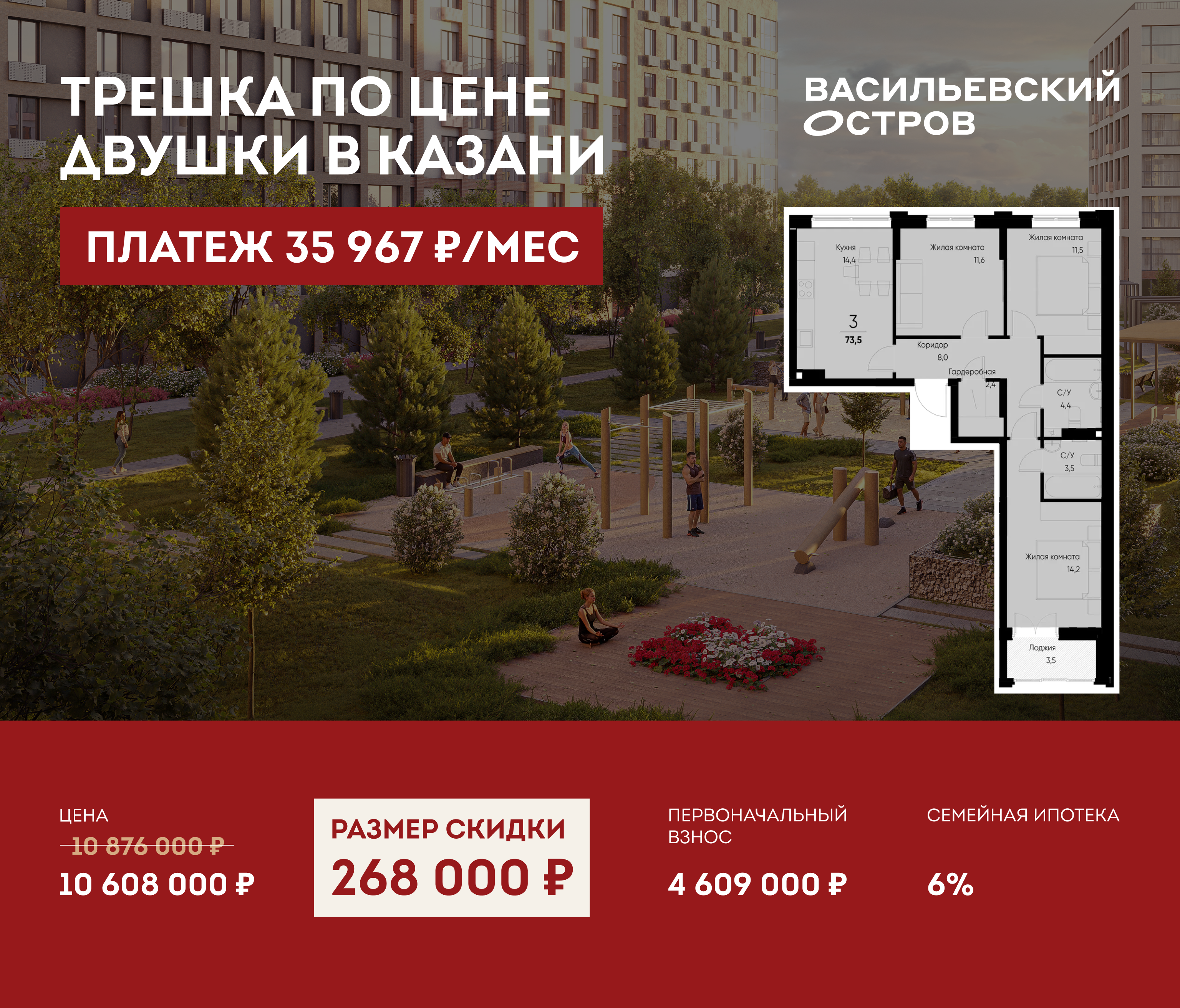 Парки и скверы «Васильевского острова» займут более 300 000 м². Это масштабные пространства для прогулок, пикников, отдыха с семьей и общения с природой.