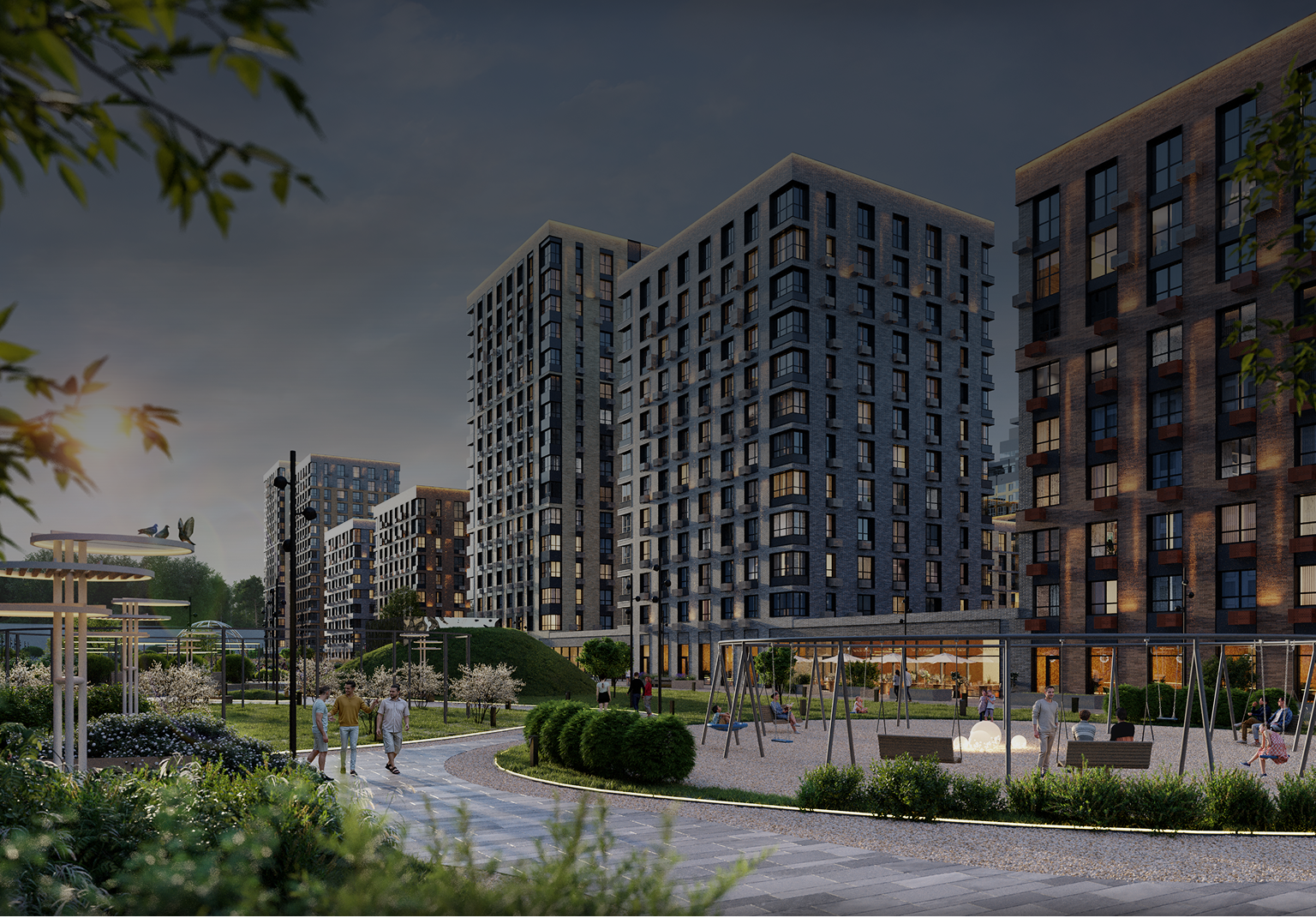 Высокие тенистые деревья, цветники и газоны, пешеходные и велодорожки, качели и зоны отдыха, арт-объекты и атмосферная вечерняя подсветка — ваше путешествие по «Патрикам» начинается именно здесь.